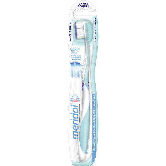 Die meridol Zahnfleisch sanft Zahnbürste reinigt die Zähne bis hin zum Zahnfleischsaum besonders gründlich und schont dabei sogar bereits gereiztes Zahnfleisch. Die schonende Putzkraft der meridol Zahnfleisch sanft Zahnbürste unterstützt Sie dabei, unangenehme Zahnfleischentzündungen zu vermeiden. Das besondere Plus: Durch ihren extra-kleinen Bürstenkopf erreichen Sie mit der meridol Zahnfleisch sanft Zahnbürste alle Zahnflächen optimal. So sorgen Sie dafür, dass sich keine zahnschädigenden Bakterien auf der Zahnoberfläche ansiedeln, und beugen Zahnfleischproblemen und Karies vor. Die meridol Zahnfleisch sanft Zahnbürste punktet mit pinselartigen, mikrofeinen Borstenenden, die Speisereste und Plaque gründlich von der Oberfläche der Zähne bis hin zum Zahnfleischsaum entfernen. Der kleine Bürstenkopf der meridol Zahnfleisch sanft Zahnbürste ist weich ummantelt, damit Sie problemlos auch in die hintersten Ecken Ihres Mundraums gelangen, ohne wundes Zahnfleisch weiter zu reizen. Der ergonomisch geformte Griff liegt bestens in der Hand, sodass sich die meridol Zahnfleisch sanft Zahnbürste wunderbar führen lässt.